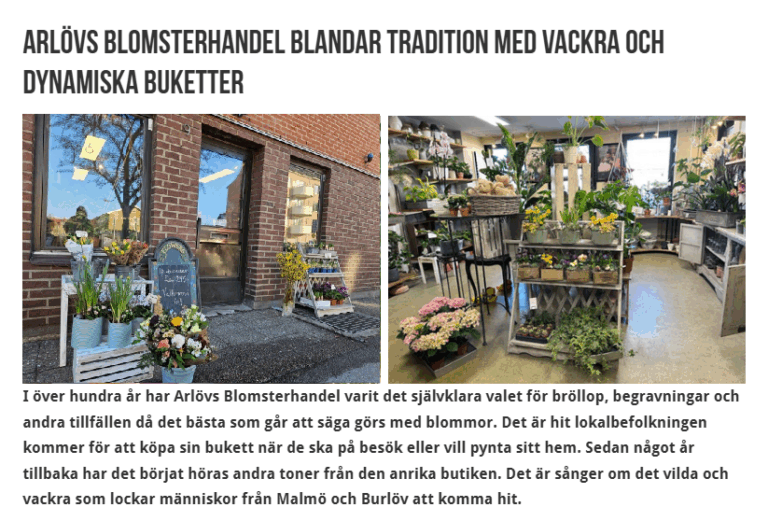 Arlövs Blomsterhandel är den lokala blomsterbutiken som alltid har tid för dig som kund. Tove och hennes team skapar varje bukett med omsorg, noggrant anpassad efter dina önskemål. Vi ger gärna kreativa förslag för att ta fram den perfekta buketten för ditt speciella tillfälle.
